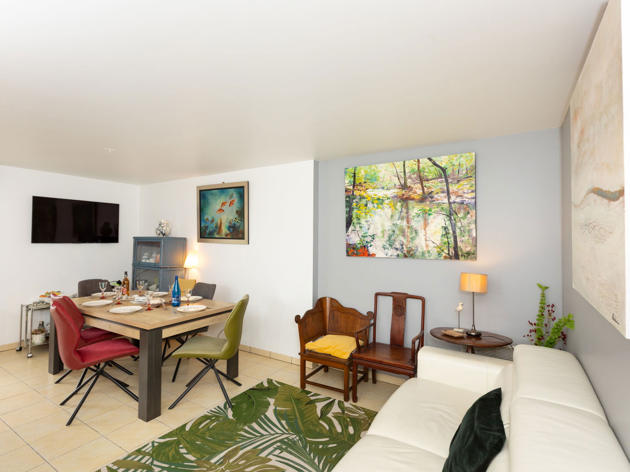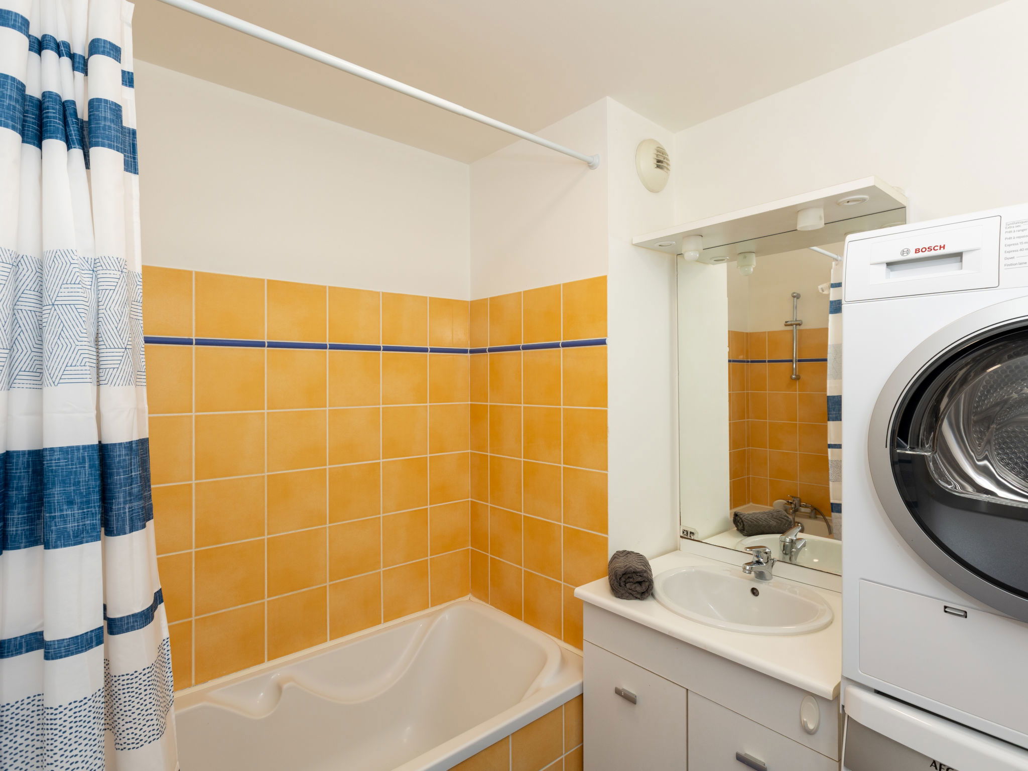 3-room apartment 62 m2, on the ground floor. Comfortable and cosy furnishings: living/dining room with 1 double sofabed (1 x 140 cm, length 190 cm), TV (flat screen). Exit to the terrace. 1 room with 1 french bed (1 x 180 cm, length 200 cm). 1 room with 2 beds (90 cm, length 190 cm). Exit to the terrace. Open kitchen (oven, dishwasher, 4 ceramic glass hob hotplates, toaster, kettle, microwave, freezer, electric coffee machine). Exit to the terrace. Bathroom, sep. WC. Electric heating. Large terrace 20 m2, south facing position. Terrace furniture. Facilities: washing machine, dryer, iron. Internet (WiFi, free). Parking. Please note: smoke alarm. Offer by a private individual according to Art. 155, IV of CGI.