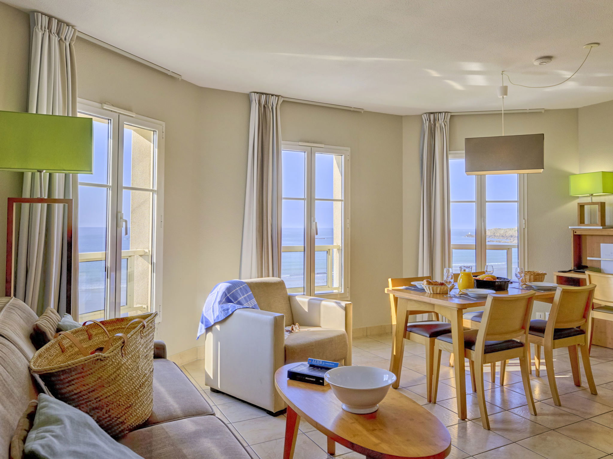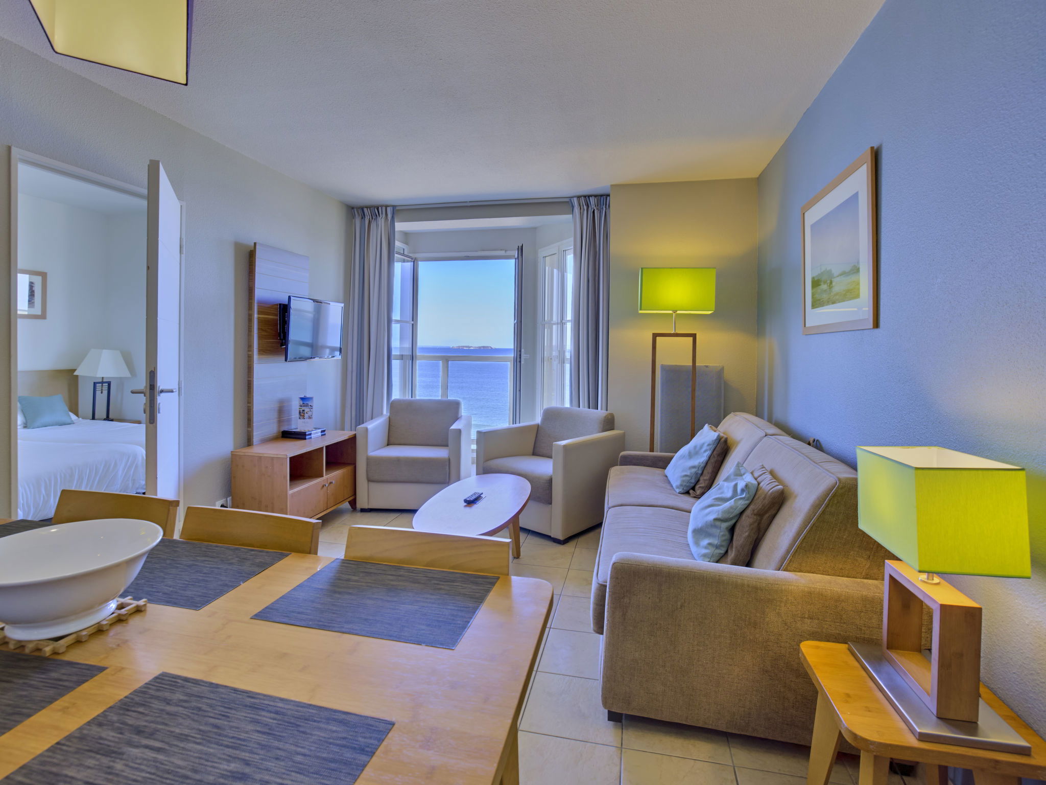 "Reine Marine (ALO301)-Appartement Face Mer", 2-room apartment 40 m2. Comfortable and beautiful furnishings: living/sleeping room with 1 double sofabed (140 cm, length 200 cm), dining table and satellite TV. 1 room with 2 beds (90 cm, length 200 cm). Kitchenette (oven, dishwasher, 4 ceramic glass hob hotplates, toaster, kettle, microwave, electric coffee machine). Bath/shower, sep. WC. Electric heating. Very beautiful panoramic view of the sea. Facilities: children's high chair, baby cot. Internet (WiFi, free). Please note: maximum 1 pet/ dog allowed. Smoke alarm. Offer by a commercial proprietor according to Art. 155, IV, CGI