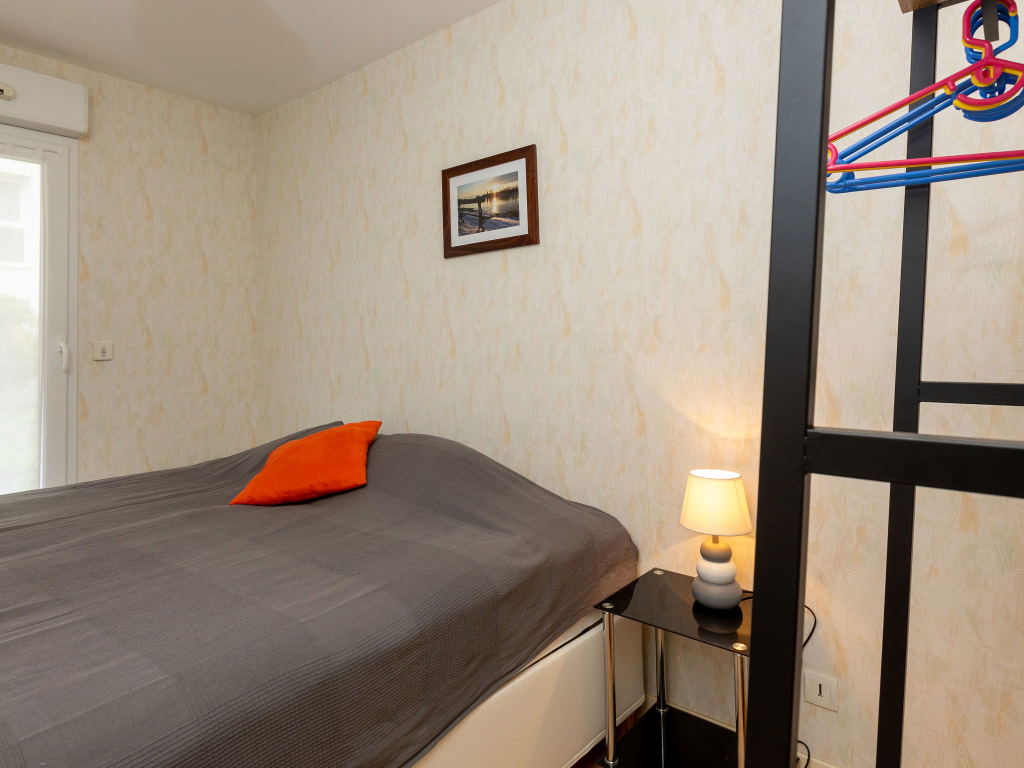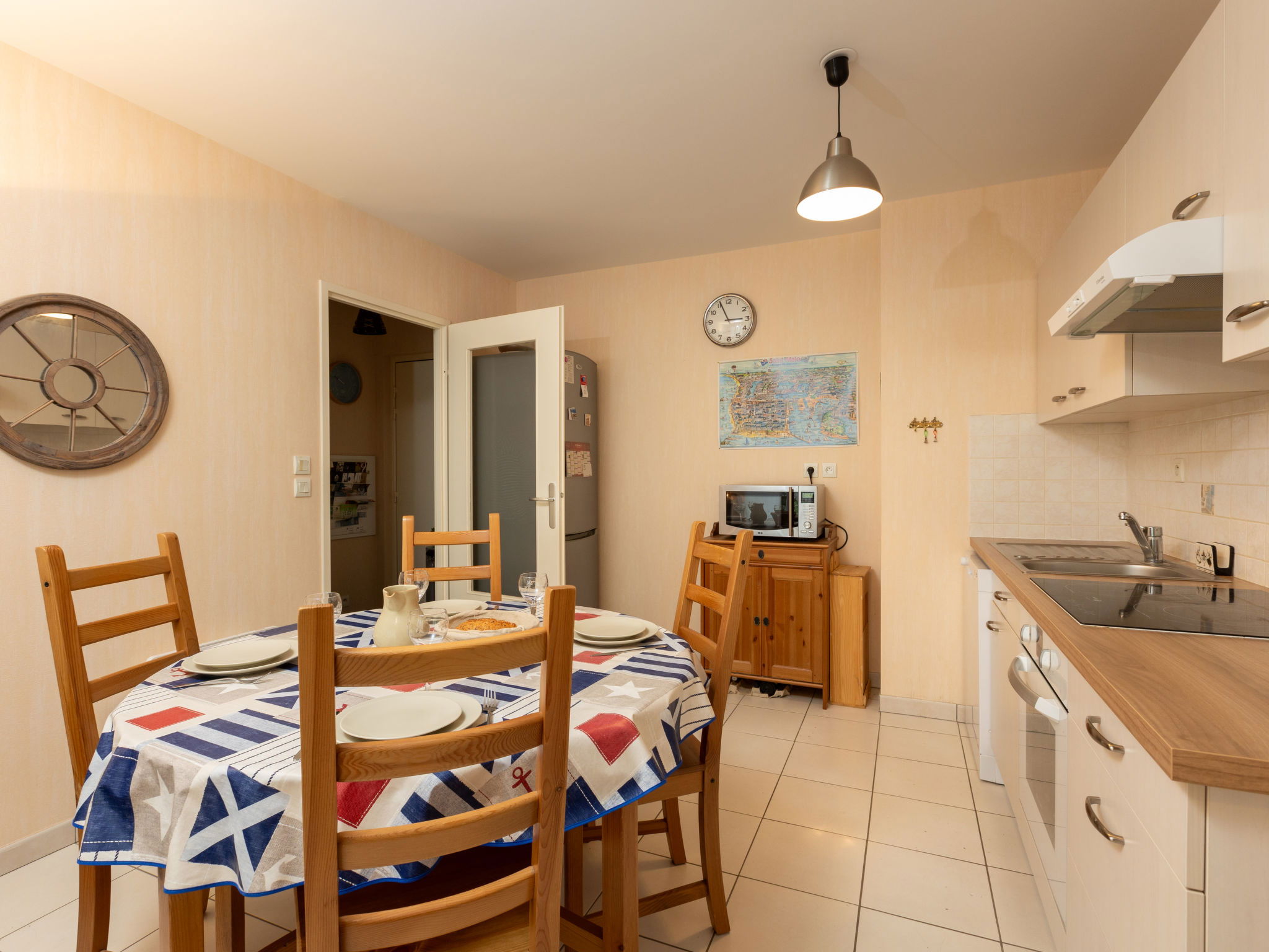 "L'air du Large", 3-room apartment 46 m2, on the upper ground floor, south-east facing position. Simple and comfortable furnishings: living/dining room with panoramic window with TV (flat screen), electric shutters. Exit to the terrace. 1 room with 2 beds (90 cm, length 190 cm). Exit to the terrace. 1 room with 2 beds (90 cm, length 190 cm). Open kitchen (oven, dishwasher, 3 induction hot plates, toaster, kettle, microwave, freezer, electric coffee machine). Shower, sep. WC. Electric heating. Terrace 10 m2, south facing position. Terrace furniture. Facilities: washing machine, dryer, iron, hair dryer. Internet (WiFi, extra). Garage. Please note: non-smokers only. Smoke alarm. Offer by a private individual according to Art. 155, IV of CGI. 3528800373919
