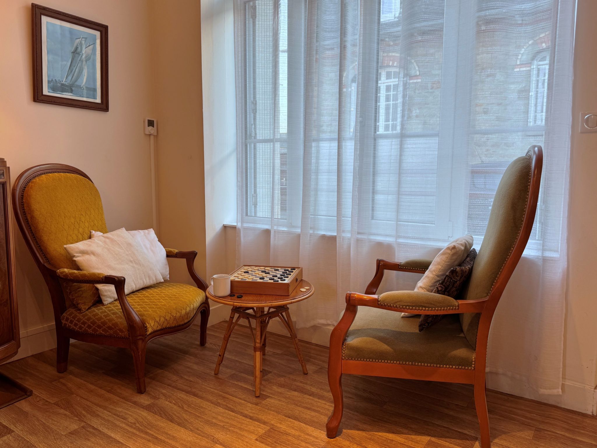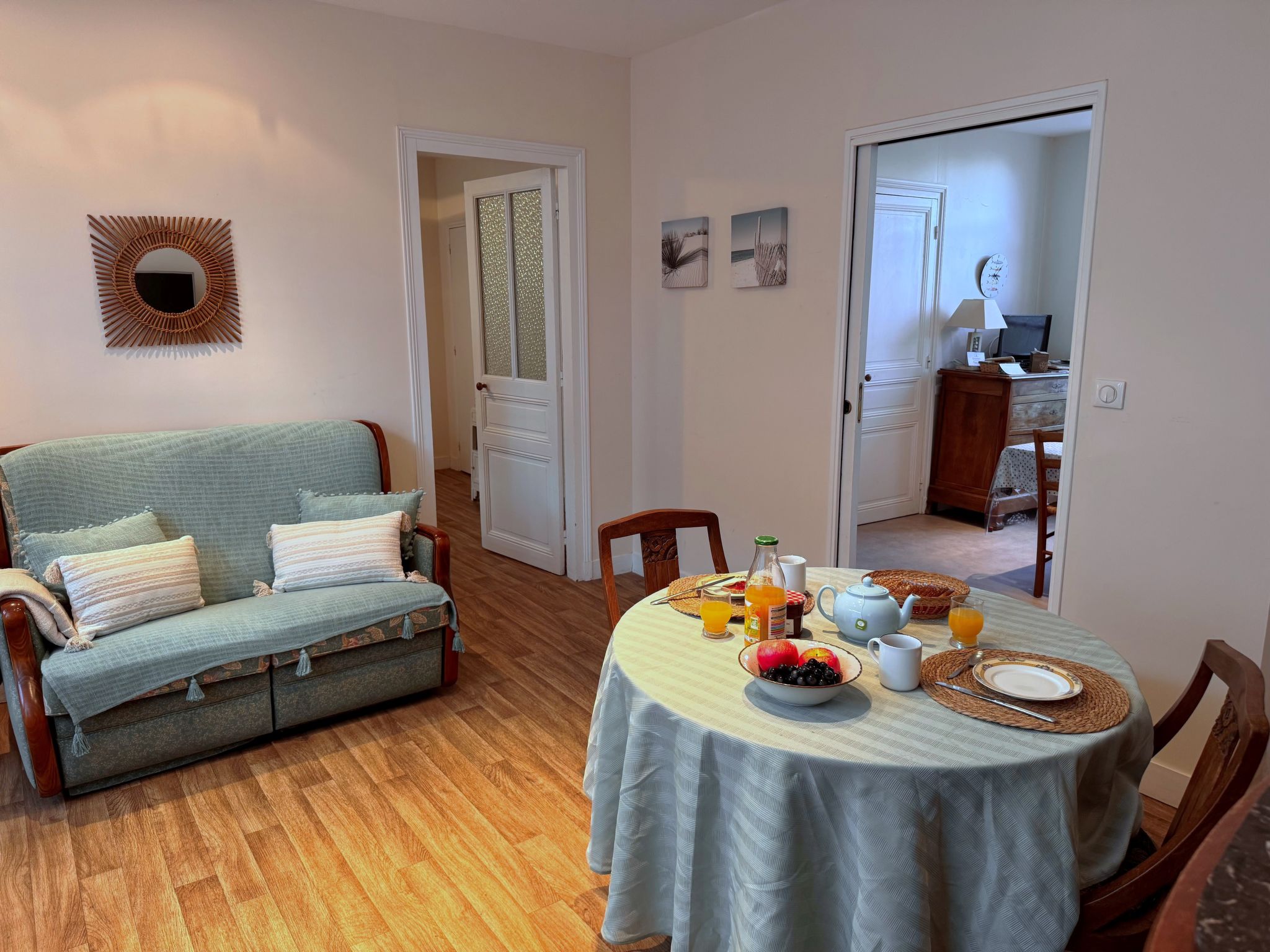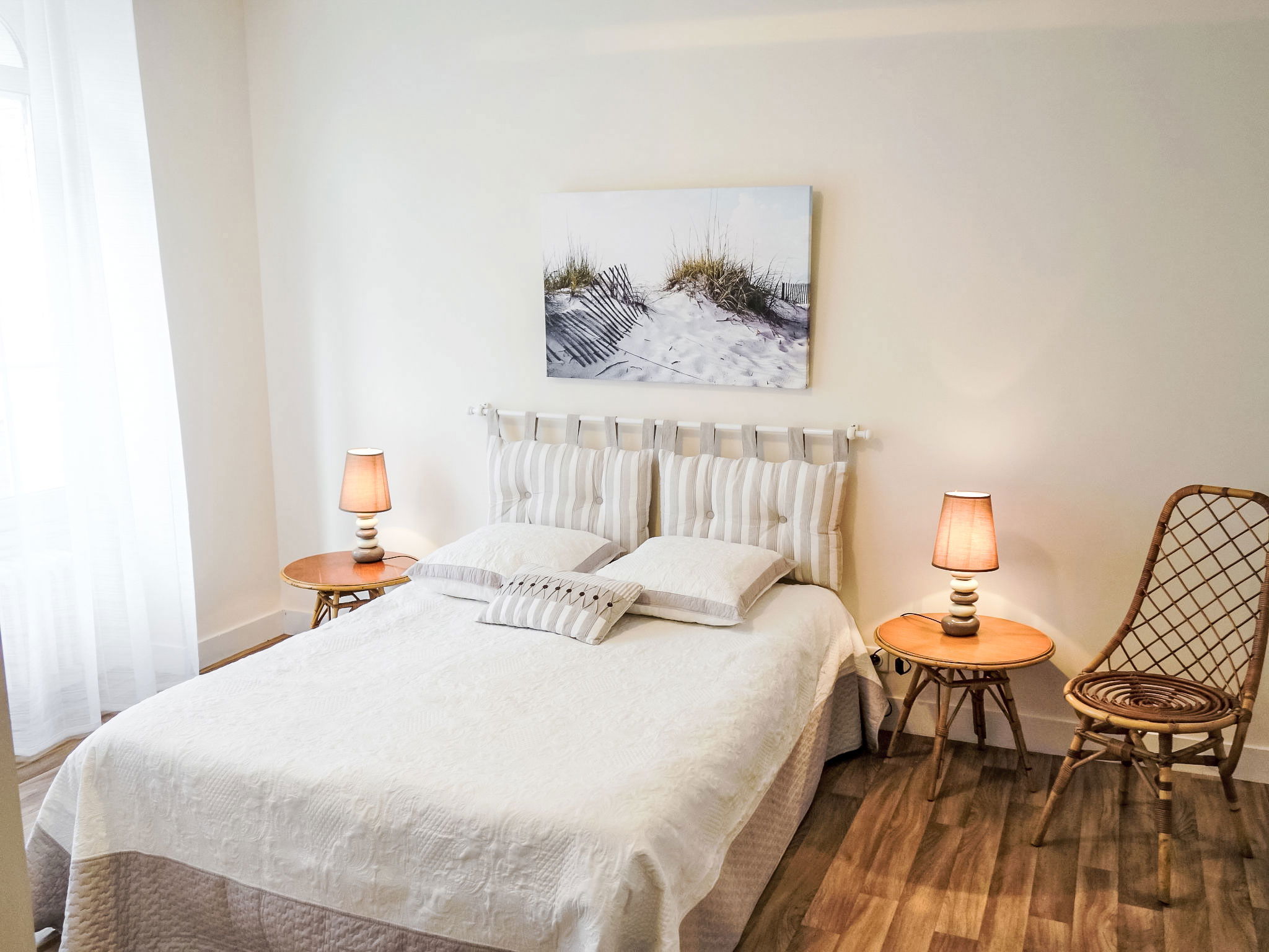 2-room house 50 m2, on the ground floor. Spacious, renovated in 2015, practical and beautiful furnishings: living/dining room with TV (flat screen). 1 room with 1 french bed (1 x 140 cm, length 190 cm), separate WC and shower. Large kitchen (dishwasher, 4 ceramic glass hob hotplates, electric coffee machine, combination microwave) with TV (flat screen). Exit to the garden. Electric heating. Facilities: washing machine, iron. Internet (WiFi, extra). Garage. Please note: apartment street side. Non-smoking house. Smoke alarm. FR3528.540.1