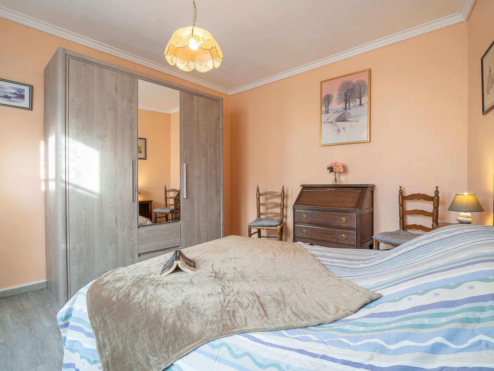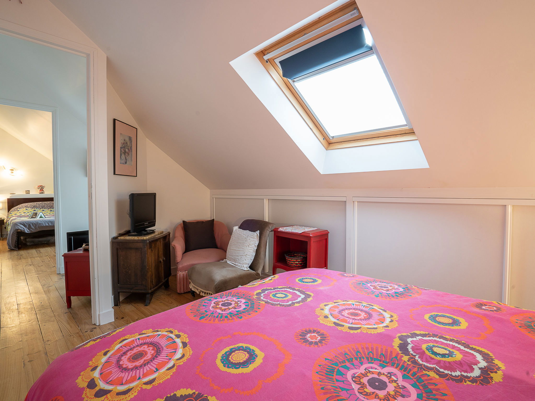 5-room house 100 m2 on 2 levels. Partly renovated, practical and rustic furnishings: living/dining room with library and TV. Exit to the garden. 2 rooms, each room with 1 french bed (1 x 140 cm, length 190 cm). Large kitchen (oven, dishwasher, 3 ceramic glass hob hotplates, microwave, electric coffee machine). Shower/WC. Gas heating. Heating available only from 15.10. to 30.04. Upper floor: 1 room with sloping ceilings with 1 french bed (1 x 140 cm, length 190 cm). 1 room with sloping ceilings with 1 french bed (1 x 140 cm, length 190 cm), TV. Shower/WC. Facilities: washing machine, iron. Internet (WiFi, extra). Please note: non-smoking house. Smoke alarm. 35288000514E1